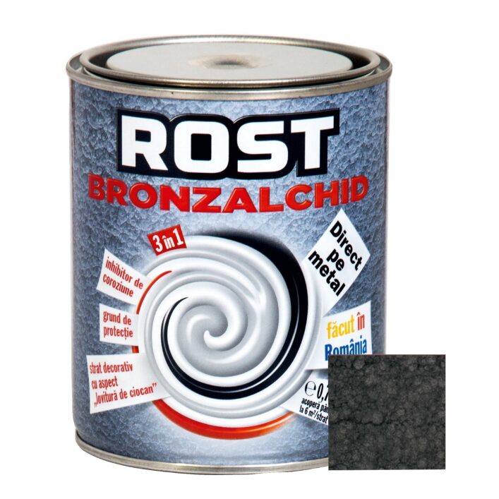 Rost Bronzalchid este un produs 3 în 1: inhibitor de coroziune, grund, strat decorativ cu aspect de “lovitură de ciocan”. Email pe bază de răşini alchidice, aditivi și pigmenți anticorozivi. Realizează trei funcţii în acelaşi timp: inhibitor de coroziune, grund, strat decorativ. Se aplică direct pe suprafaţa metalică nefiind necesară o grunduire prealabilă. Asigură obţinerea unorfinisaje cu aspect decorativ specific tip lovitură de ciocan. Prezintă aplicabilitate uşoară, excelentă aderenţă, are o foarte bună rezistenţă la uzură şi intemperii.