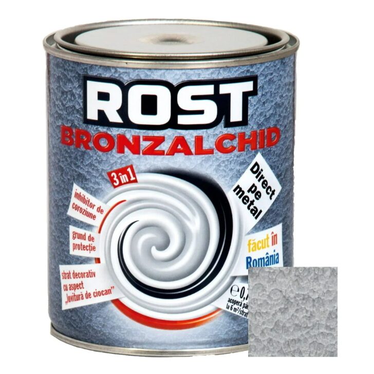 Rost Bronzalchid este un produs 3 în 1: inhibitor de coroziune, grund, strat decorativ cu aspect de “lovitură de ciocan”. Email pe bază de răşini alchidice, aditivi și pigmenți anticorozivi. Realizează trei funcţii în acelaşi timp: inhibitor de coroziune, grund, strat decorativ. Se aplică direct pe suprafaţa metalică nefiind necesară o grunduire prealabilă. Asigură obţinerea unorfinisaje cu aspect decorativ specific tip lovitură de ciocan. Prezintă aplicabilitate uşoară, excelentă aderenţă, are o foarte bună rezistenţă la uzură şi intemperii.