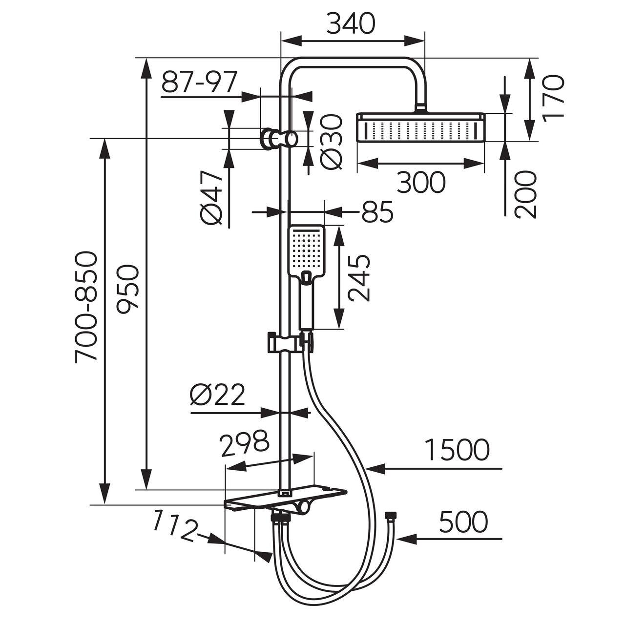 - bara metalica de dus fixa 950 mm, cu distanta reglabila intre suporti - poate fi instalat in gauri deja existente in perete