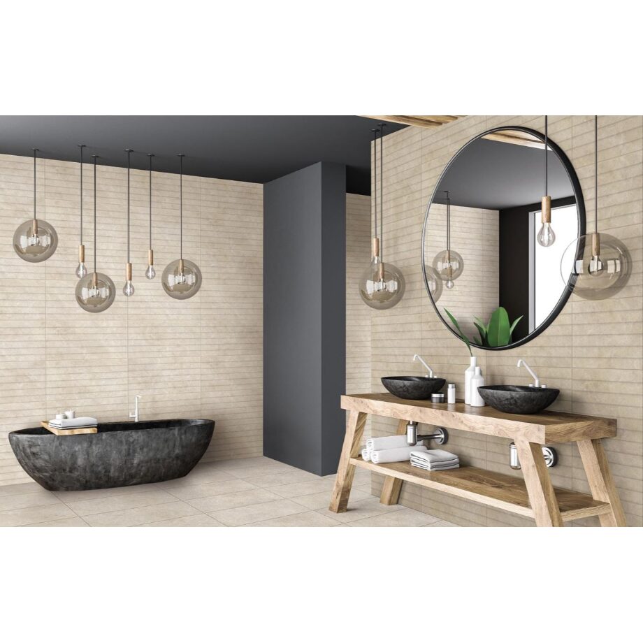 CESAROM® Cream este o colecție de gresie porțelanată și faianță 60x30 cm care mizează pe eleganța pietrei naturale în nuanțe calde de bej. Ideală atât pentru amenajări interioare cât și exterioare, colecția CESAROM® Cream reprezintă o alegere inspirată pentru decorarea pereților și pardoselilor din băi, livinguri și terase. Inspirate din natură faianțele acestei colecții se potrivesc perfect pentru peretele oricărei băi sau bucătării, iar prin relieful cu forme circulare și în combinație cu brâul CESAROM® Metalic creează un spațiu elegant și cu mult stil.