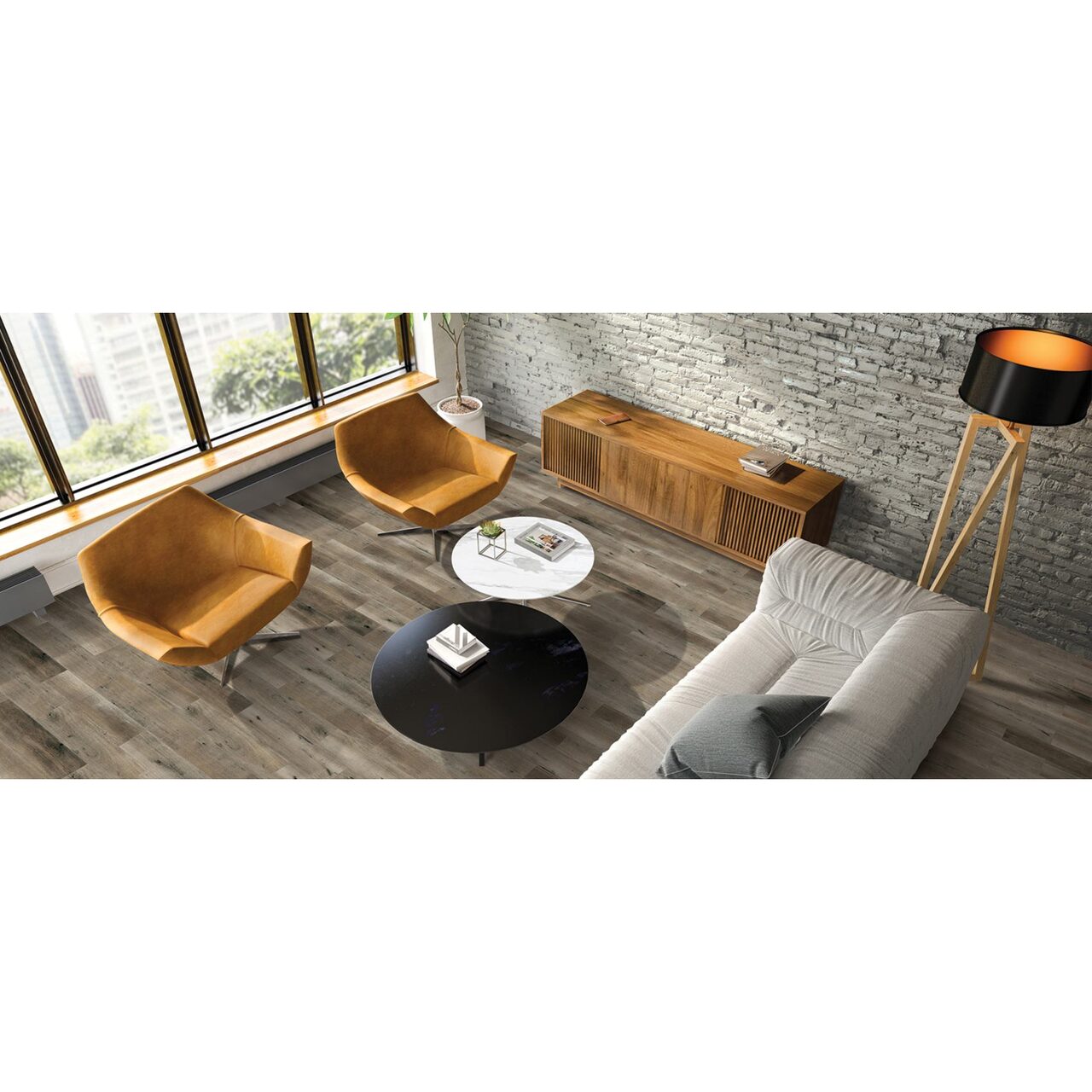Gresia porțelanată din colecția CESAROM® Pavimento surprinde prin textura lemnului în nuanțe de gri, bej și maro și este disponibil în formatul 60x15 rectifi...
