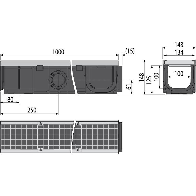 Rigolă de exterior de 100 mm cu ramă metalică și grătar galvanizat, clasa C250