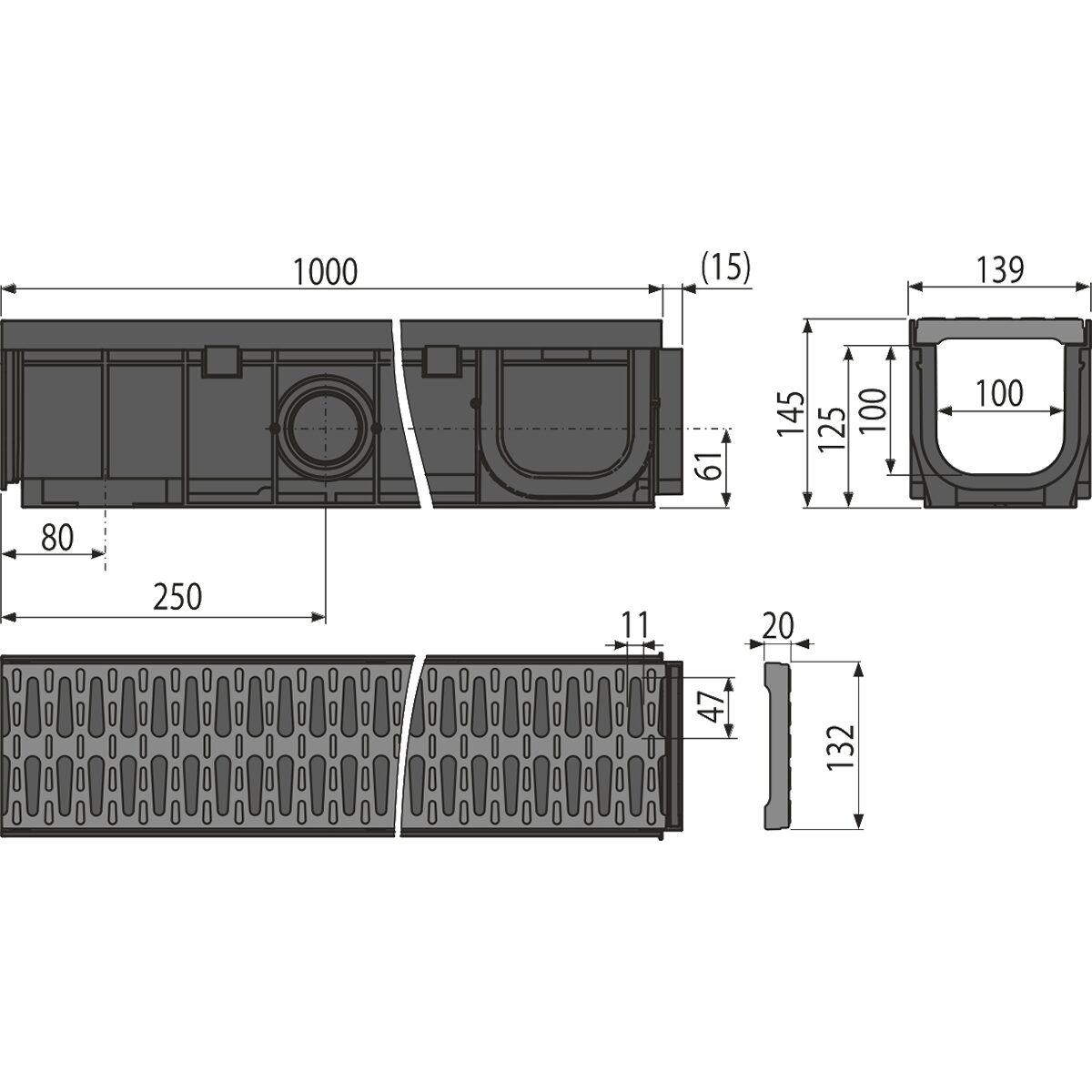 Rigolă de exterior 100 mm cu ramă din plastic și grătar din plastic, clasa A15