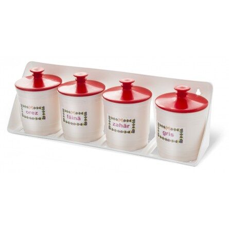Setul conține patru recipiente de bucătărie de culoare albă, fabricate din plastic durabil, ideal pentru depozitarea alimentelor sau condimentelor. Acestea sunt prevăzute cu capace sigure, asigurând păstrarea prospețimii și protejarea conținutului de contaminare. Designul simplu și funcțional se integrează ușor în orice bucătărie.